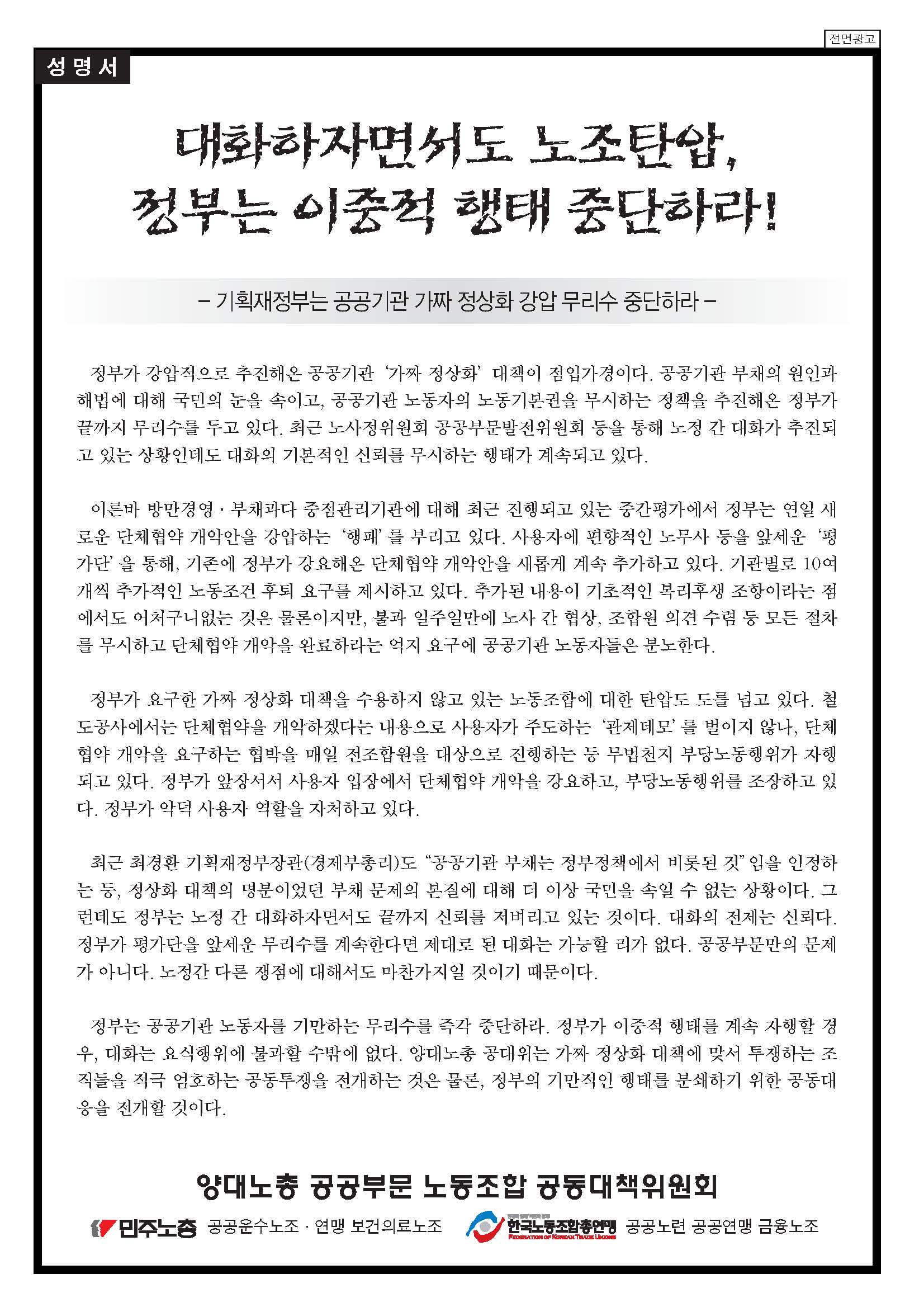 [¼º¸í¼­] ´ëÈ­ÇÏÀڸ鼭µµ ³ëÁ¶Åº¾Ð, Á¤ºÎ´Â ÀÌÁßÀû ÇàÅ Áß´ÜÇ϶ó!!