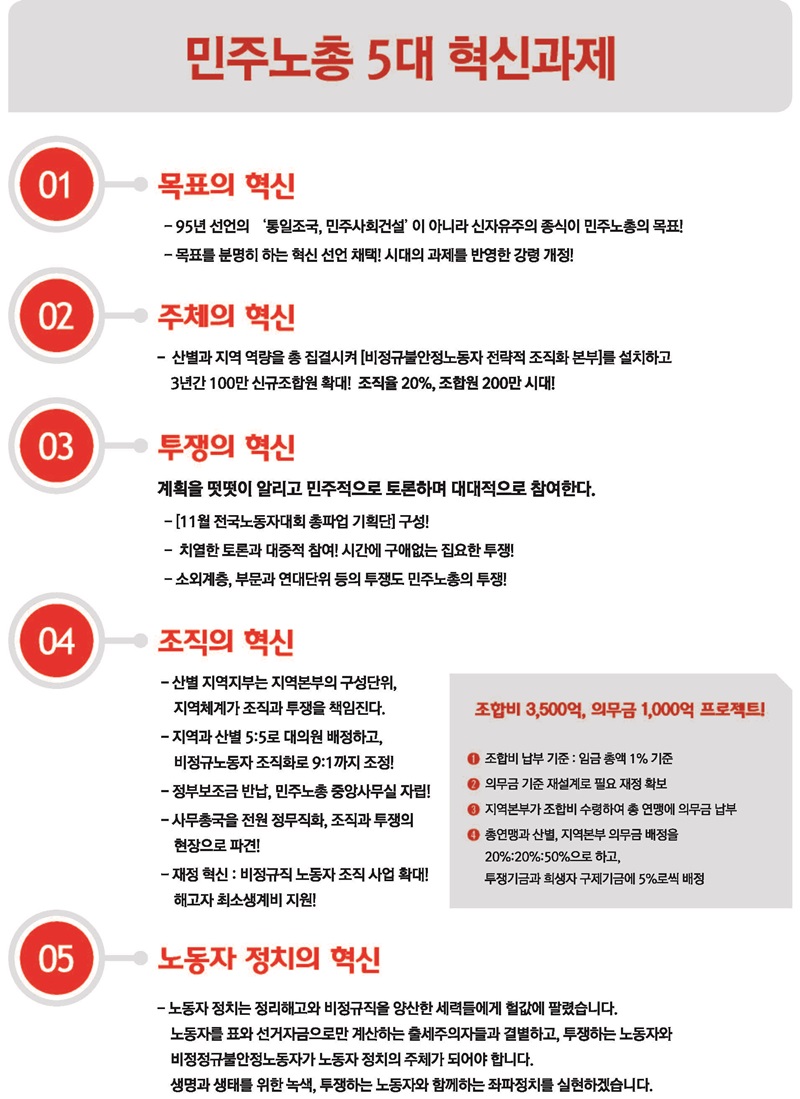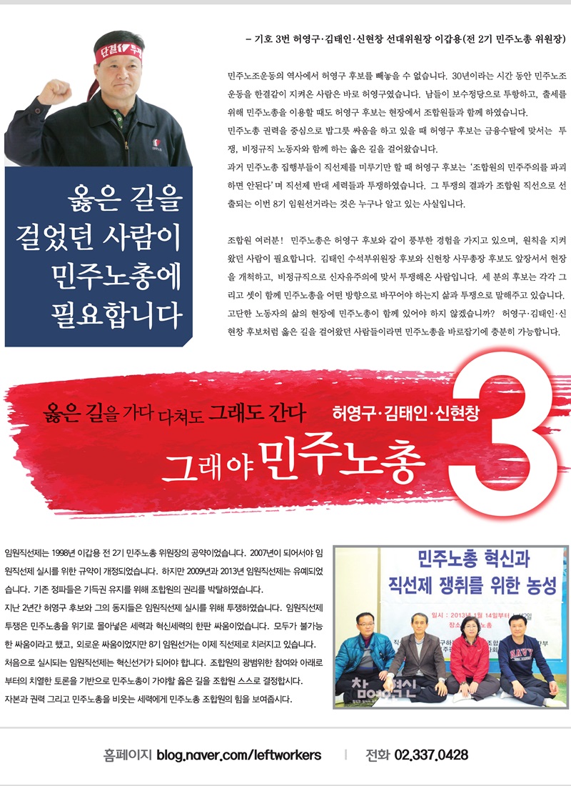 2012³âºÎÅÍ´Â ÁÂÆÄ³ëµ¿ÀÚȸ ´ëÇ¥¸¦ ¸Ã¾Æ ºñÁ¤±ÔºÒ¾ÈÁ¤³ëµ¿ÀÇ ¹®Á¦Á¡À» ¼³ÆÄÇϰí ÅõÀïÇØ¿ÔÀ¸¸ç ±âº»¼Òµæ°ú ÃÖÀúÀÓ±Ý 1¸¸¿ø ÅõÀïÀ» Çϰí ÀÖ´Ù. 2013³âºÎÅÍ´Â ¾Ë¹Ù³ëÁ¶ ÁöµµÀ§¿øÀ» ¸ÃÀ¸¸ç ºñÁ¤±ÔºÒ¾ÈÁ¤³ëµ¿ öÆó ÅõÀï¿¡ ¾ÕÀå¼°í ÀÖ´Ù.