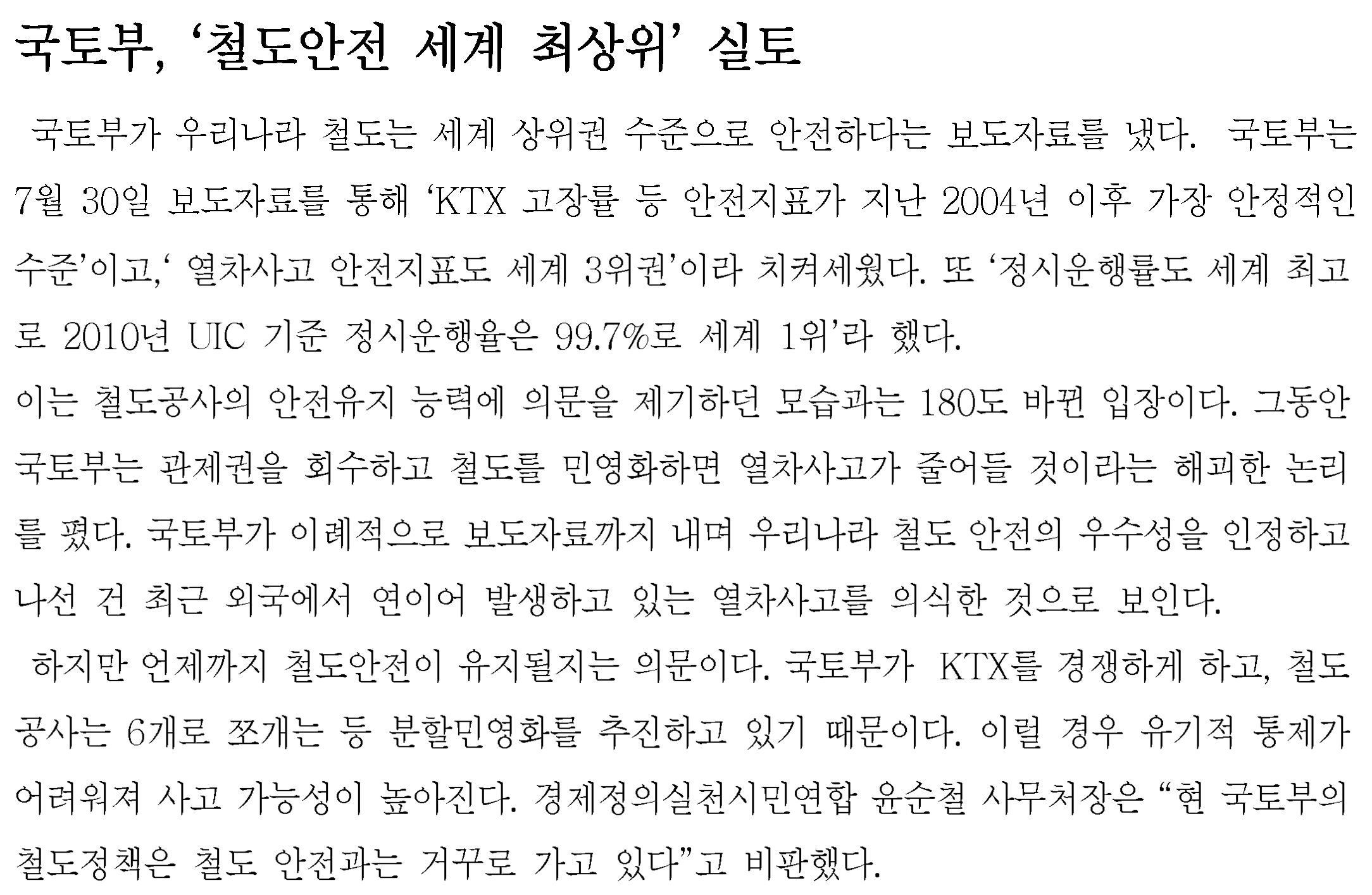 ±¹ÅäºÎ°¡ ¿ì¸®³ª¶ó öµµ´Â ¼¼°è »óÀ§±Ç ¼öÁØÀ¸·Î ¾ÈÀüÇÏ´Ù´Â º¸µµÀڷḦ ³Â´Ù. ±¹ÅäºÎ´Â 7¿ù 30ÀÏ º¸µµÀڷḦ ÅëÇØ ¡®KTX °íÀå·ü µî ¾ÈÀüÁöÇ¥°¡ Áö³ 2004³â ÀÌÈÄ °¡Àå ¾ÈÁ¤ÀûÀÎ ¼öÁØ¡¯À̰í,¡® ¿Â÷»ç°í ¾ÈÀüÁöÇ¥µµ ¼¼°è 3À§±Ç¡¯À̶ó Ä¡ÄѼ¼¿ü´Ù. ¶Ç ¡®Á¤½Ã¿îÇà·üµµ ¼¼°è ÃÖ°í ·Î 2010³â UIC ±âÁØ Á¤½Ã¿îÇàÀ²Àº 99.7%·Î ¼¼°è 1À§¡¯¶ó Çß´Ù.