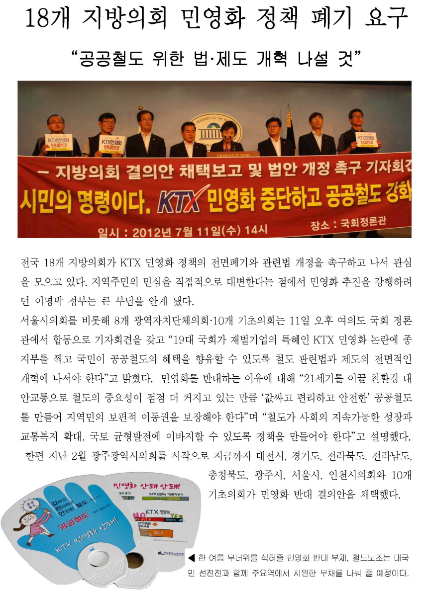 697 18°³ Áö¹æÀÇȸ ¹Î¿µÈ­ Á¤Ã¥ Æó±â ¿ä±¸ ¡°°ø°øÃ¶µµ À§ÇÑ ¹ý¡¦ öµµ³ëÁ¶ 07-20 845