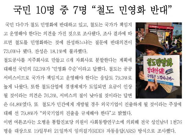 ±¹¹Î 10¸í Áß 7¸í ¡°Ã¶µµ ¹Î¿µÈ­ ¹Ý´ë¡±