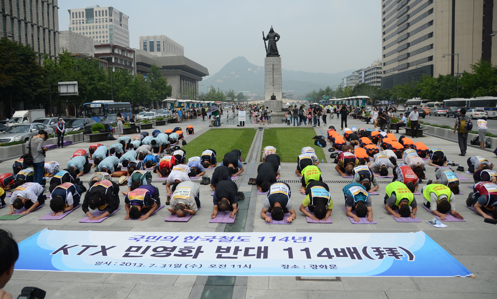 °¢°è Àλç¿Í öµµ³ëµ¿ÀÚ°¡ ¼¿ï ±¤È¹®±¤Àå°ú Àü±¹ 4°³ ¿ª¿¡¼ öµµ¹Î¿µÈ ¹Ý´ë¿Í °ø°øÃ¶µµ °ÈÀÇ ¿°¿øÀ» ´ã¾Æ ±âÀÚȸ°ß°ú 114¹è ¹× ÆÛÆ÷¸Õ½º¸¦ °¡Á³´Ù. ¡®Ã¶µµ¹Î¿µÈ ¹Ý´ë¡¯ °ø¾à±îÁö Çß´ø ¹Ú±ÙÇý ´ëÅë·ÉÀÇ ¹¬¹¬ºÎ´äÀ» ºñÆÇÇϰí, ºÒ¹ýÀûÀ̱â±îÁö ÇÑ ¹Î¿µÈ Á¤Ã¥À» ÀϹæÀûÀ¸·Î ÃßÁøÇϰí ÀÖ´Â Á¤ºÎ °ü·áµé¿¡°Ô °æÁ¾À» ¿ï¸®±â À§Çؼ´Ù.