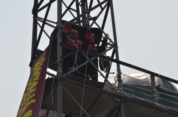 ÇÑÆí öž ¾Æ·¡´Â ¸ÅÀÏ 50¿© ¸íÀÇ °ü¸®ÀÚµéÀÌ ÁøÀ» Ä¡°í Á¶ÇÕ¿øÀÇ Á¢±ÙÀ» Â÷´ÜÇϰí ÀÖ°í, ¹ÝÀԵǴ ¹°°ÇµéÀ» °¨½ÃÇϰí ÀÖ´Ù. ±Þ±â¾ß ¶ß°Å¿î ÇÞ»ìÀ» Á¶±ÝÀÌ¶óµµ °¡¸®±â À§ÇØ Â÷¾ç¸·À» ¿Ã¸®·Á ÇÏ¿´À¸³ª À̰ÍÁ¶Â÷µµ °Ý·ÄÇÏ°Ô ¸öÀ¸·Î ¸·¾Æ¼°í ÀÖ´Ù.