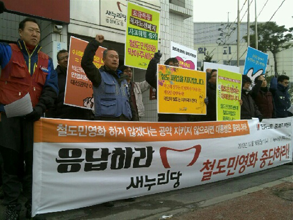 Àü±¹ »õ´©¸®´ç»ç ¾Õ¿¡¼ ¿¸° ±âÀÚȸ°ß¿¡¼ ½Ã¹Î»çȸ´ÜüµéÀº ¡°Ã¶µµ¹Î¿µÈ´Â öµµ»ê¾÷ÀÇ °ø°ø¼ºÀ» ÆÄ±«ÇÑ´Ù¡±¸ç ¡°ÇÏÁö¸¸ Á¤ºÎ´Â ¹Î¿µÈ´Â ¾Æ´Ï¶ó´Â ÇãÆ°¼Ò¸®¸¸ µÇÇ®ÀÌÇϰí ÀÖ´Ù¡±°í ¹àÇû´Ù.