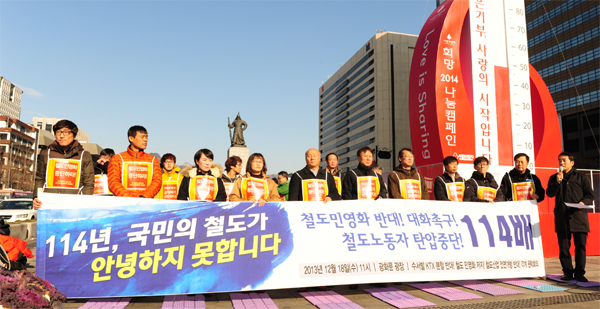 ½Ã¹Î»çȸ´Üü µî °¢°è ´ëÇ¥ÀÚµéÀº ±¤È¹®±¤Àå¿¡¼ ¡®Ã¶µµ ¹Î¿µÈ ¹Ý´ë ¹× öµµ³ëµ¿ÀÚ Åº¾Ð Áß´Ü Ã˱¸¡¯ ±âÀÚȸ°ßÀ» ¿°í, ¿ì¸®³ª¶ó öµµ 114³âÀÇ ¿ª»ç¸¦ ÀǹÌÇÏ´Â ¡®114¹è¡¯¸¦ Çß´Ù.