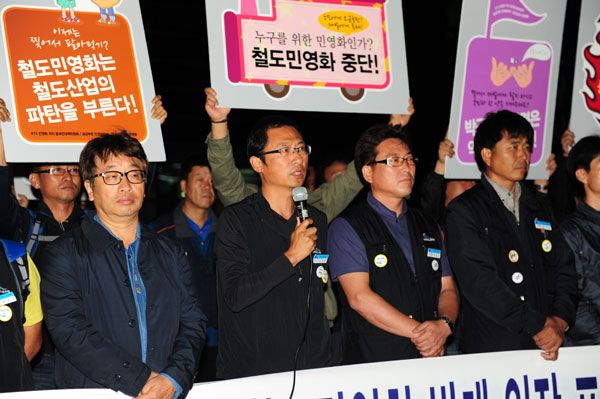 ½Ã¹Î»çȸ´Üü¿Í öµµ³ëÁ¶°¡ öµµ°ø»ç »çÀå ÃëÀÓ½ÄÀÌ ¿¸®´Â ´ëÀü º»»ç¸¦ ã¾Æ ±âÀÚȸ°ßÀ» ¿°í ¡®±¹ÅäºÎÀÇ Ã¶µµ¹Î¿µÈ ÃßÁø¿¡ ´ëÇÑ ÃÖ¿¬Çý »çÀåÀÇ °ø½ÄÀÔÀ塯À» ¿ä±¸Çß´Ù. Áö³ 2ÀÏ ¿ÀÈÄ 7½Ã¿¡ ¿¸° ±âÀÚȸ°ß¿¡¼ Âü¼®ÀÚµéÀº ¡°±×µ¿¾È »çÀå °ø¸ð °úÁ¤¿¡¼ È帷ΠÁö¿øÇÑ Àλçµé¿¡°Ô ±¹¹ÎÀÇ ±³Åë±âº»±ÇÀΠöµµ¿¡ ´ëÇÑ Ã¶Çаú ¼Ò½Å ±×¸®°í Àü¸Á¿¡ ´ëÇØ ÀÔÀåÀ» ¹àÈú °ÍÀ» ¿ä±¸ÇØ ¿ÔÀ¸³ª, ÁúÀÇ¿¡ ´äÇÏÁö ¾Ê¾Ò´Ù¡±¸ç ¡°Ã¶µµºÐÇҹοµÈ¿¡ ´ëÇÑ ÀÔÀåÀ» ¹àÇô¾ß ÇÑ´Ù¡±°í °Á¶Çß´Ù.