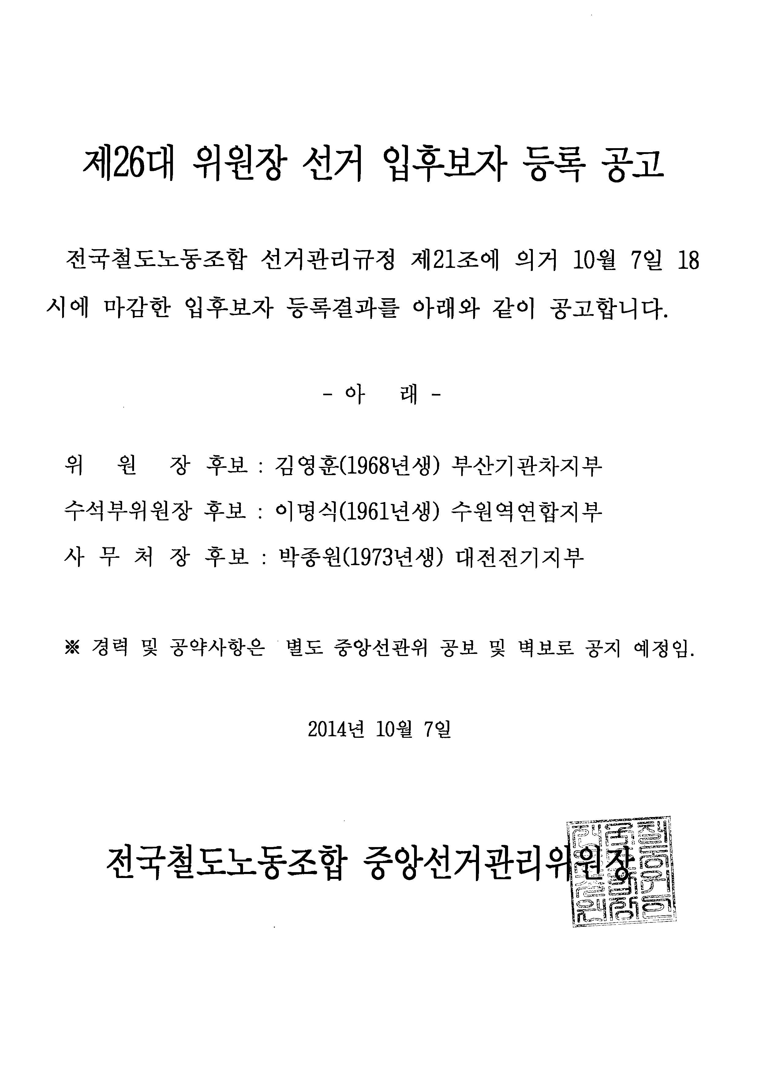 [°ø°í] Á¦26´ë À§¿øÀå ¼±°Å ÀÔÈĺ¸ÀÚ µî·Ï °ø°í