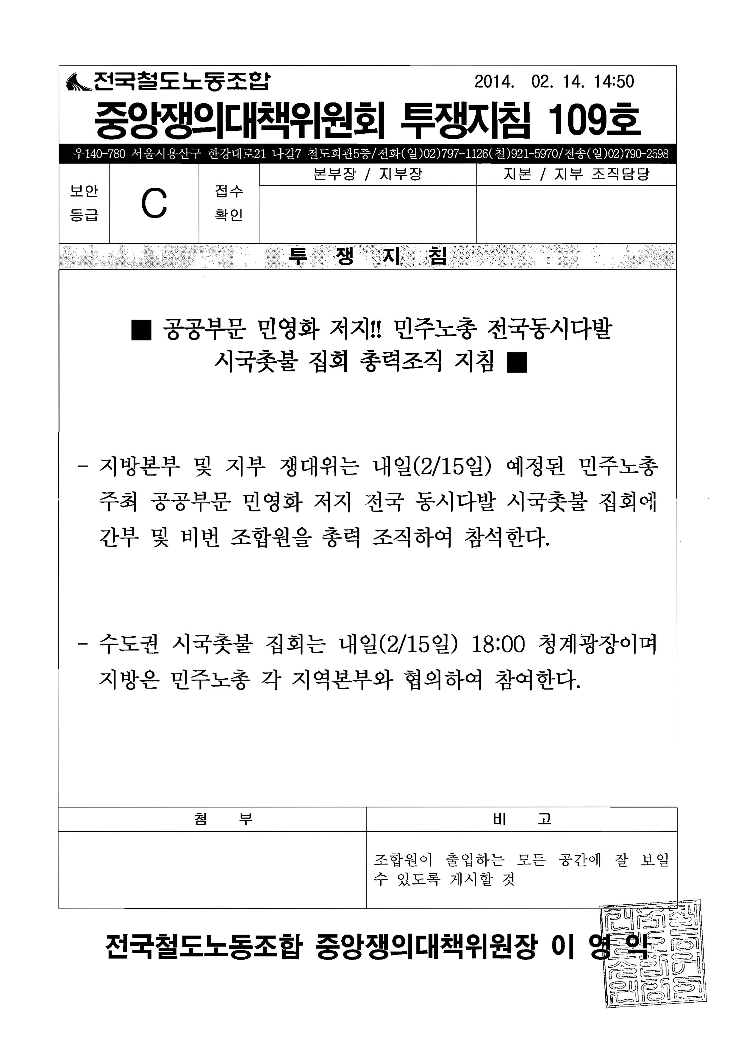 [Áß¾ÓÀï´ëÀ§ ÅõÀïÁöħ 109È£] ¹ÎÁÖ³ëÃÑ Àü±¹µ¿½Ã´Ù¹ß ÃкÒÁýȸ ÃÑ·ÂÁ¶Á÷ Áöħ