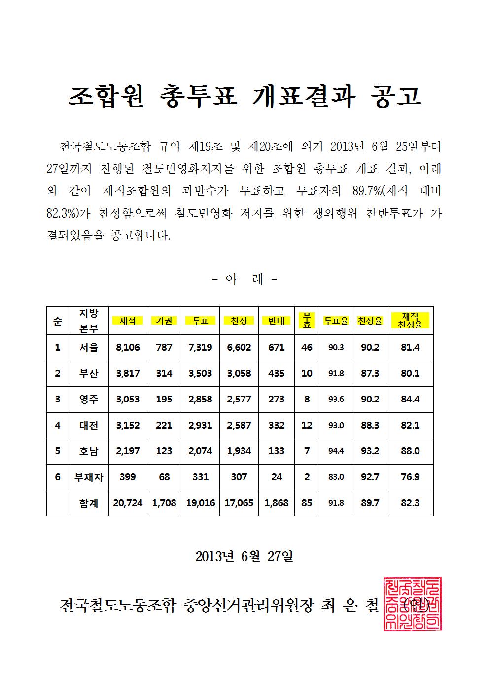 [º¸µµÀÚ·á] öµµ³ëÁ¶ ¹Î¿µÈÀúÁö ÃÑÆÄ¾÷ Âù¹ÝÅõÇ¥ °á°ú