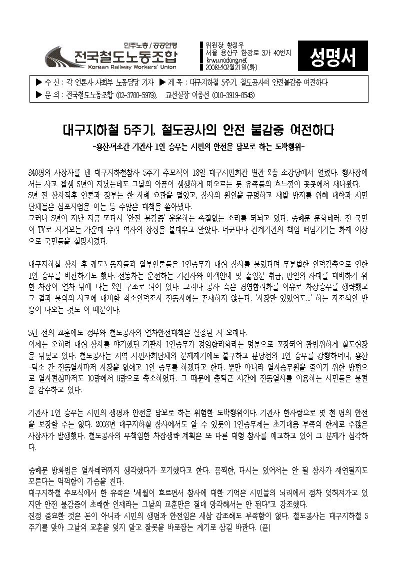 3 [¼º¸í¼­]´ë±¸ÁöÇÏö 5ÁÖ±â, öµµ°ø»çÀÇ ¾ÈÀü ºÒ°¨Áõ ¿©ÀüÇÏ¡¦ ¿î¿µÀÚ 04-02 3465