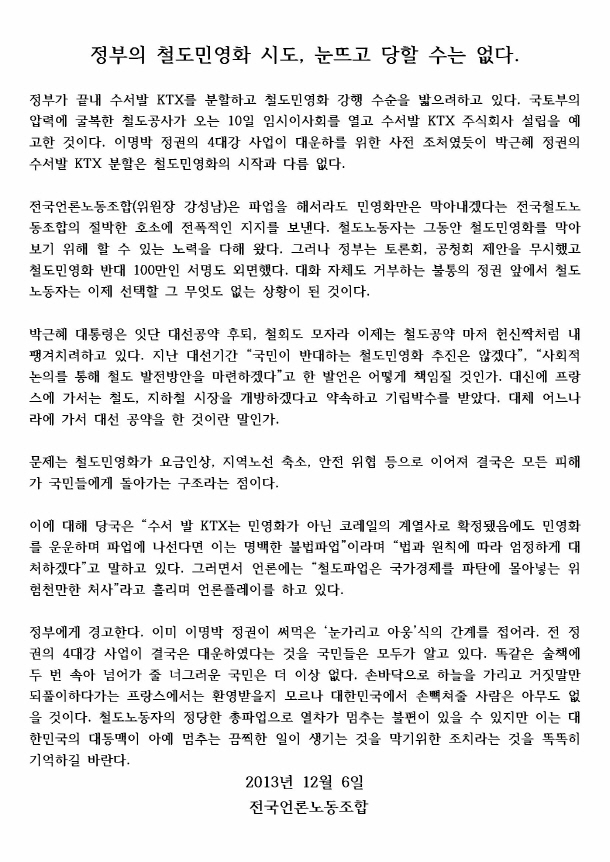 [¾ð·Ð³ëÁ¶¼º¸í¼­]Á¤ºÎÀÇ Ã¶µµ¹Î¿µÈ­ ½Ãµµ, ´«¶ß°í ´çÇÒ ¼ö´Â ¾ø´Ù.