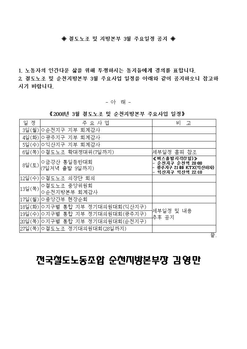 öµµ³ëÁ¶ ¹× ¼øÃµÁö¹æº»ºÎ 3¿ù ÁÖ¿äÀÏÁ¤ °øÁö [ÀÌ °Ô½Ã¹°Àº ¿î¿µÀÚ´Ô¿¡ ÀÇÇØ 2008-04-08 10:46:35 ¾Ë¸²/¼Ò½Ä¿¡¼­ À̵¿ µÊ]
