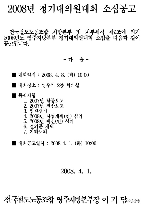 2008³âµµ ¿µÁÖÁö¹æº»ºÎ Á¤±â´ëÀÇ¿ø´ëȸ °ø°í